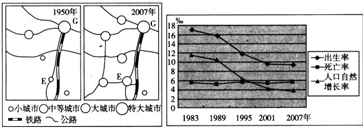 5、综合题 下面左图为“某地区城市发展变化示意图”,右图为“G城人口变化示意图”,读图回答下列问题。(1)据左图归纳出1950~2007年间该地区城市发展变化的特征。
