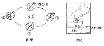 (4)当地球公转位于②位置时,图乙中武汉、汕头、海口三个城市,正午太阳直射________市,白昼最长的是________市。