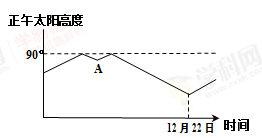 【小题1】图中显示,12月22日时该地正午太阳高度角达到全年最小值,说明位于北半球;该地一年中有两天正午太阳高度达到90°,即一年中有两次太阳直射的机会,因此位于南北回归线之间。综合上述分析可知,该地位于0°— 23°26′N之间。