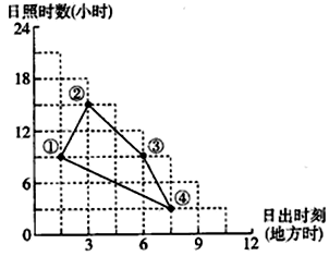 3、单选题 下图是不同地点6月22日的日出时刻与日照时数之间的关系。读图,回答下列各题: