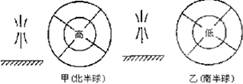 (2)在甲、乙两图的左侧图上,画出气压中心的气流方向。