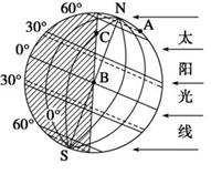 4、单选题 下图,N为北极点,大圆为经线圈,ACB为赤道, 据此完成下列各题。