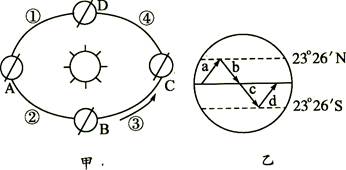 1、单选题 读图中甲、乙两幅图,从3月21日前后到6月22日前后,此时期