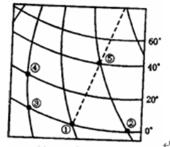 5、单选题 下图中虚线是地球公转到近日点附近的晨昏线,①点以西是东半球,以东是西半球,①点和②、③点两点间的最短距离是3330千米。回答小题:1.图中③点的经度是:2.此时北京时间是:3.图中⑤点的昼长约为: