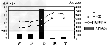 3、单选题 下图为我国五个省级行政区某年人口出生率、人口自然增长率、人口总数的统计图,读图回答1-2题。