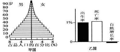 第(1)题,甲国人口年龄金字塔底宽上窄,说明出生率高,年轻人口多,故甲国的人口增长模式属于传统型;从图中可以看出,乙国的人口为低出生、低死亡,且死亡率高于出生率,人口出现负增长,故乙国人口增长模式属于现代型。