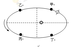 小题2:地球从甲处经乙、丙、丁回到甲公转一周(甲、乙、丙、丁之间等距)四段之间用时最少的是