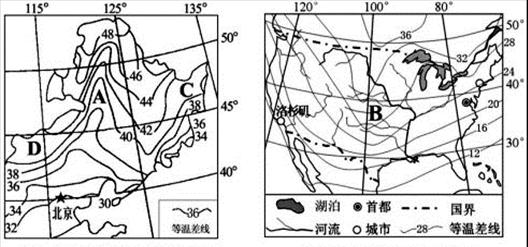 (1)根据图甲中国东北部地区气温年较差分布图判读,可看出其中A地等温差线是向高纬度(即向北)突出,弯向较高值,而图乙美国本土气温年较差分布图中,B地等温差线是向低纬度(即向南)突出,弯向较低值;联系实际可判断A处为大兴安岭,年温差偏小;B处为美国中央大平原,年温差偏大,由此可判断主要影响因素是地形。