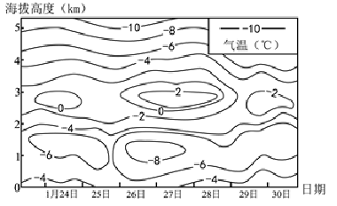 2、单选题 若近地面的气温低于0°C,从天空降落的雨滴,与地物接触后即刻冻结的天气现象称为冻雨。下图示意我国南方某地1月24日~30日垂直方向的气温变化,读图完成下列各题。