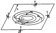 (2)北气旋气流从四周流入中心,且过A、B、C、D任意一点画出气压梯度力,发现气流的运动方向向右偏转