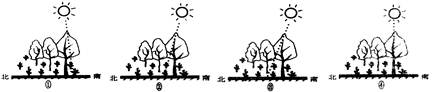 5、单选题 如图为某日广州、武汉、北京和海口四城市的正午时分同等高度的树木成影示意图,完成问题。