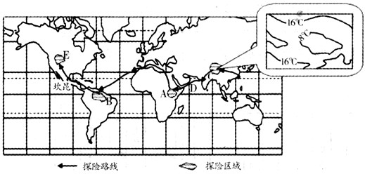 4、综合题 我国某校"环球探险社团"在暑期进行了网上模拟探险活动,下图表示探险区域和探险路线,读图回答下列各题。