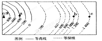 【小题3】b区域位于海洋底部,不可能是山谷 ,A错。b区域等值线密集,可能来源:91exam .org是大陆坡,B对。不能判断a地是板块交界处多地震,C错。c地位于水洋底部,等值线较稀疏,可能是海盆,D错。