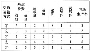4、单选题 下表中数字1~5表示海运、河运、航空、公路、铁路5种交通运输方式优劣的大体排序(“1→5”表示“优→劣”)。分析表格数据,完成1~2题。
