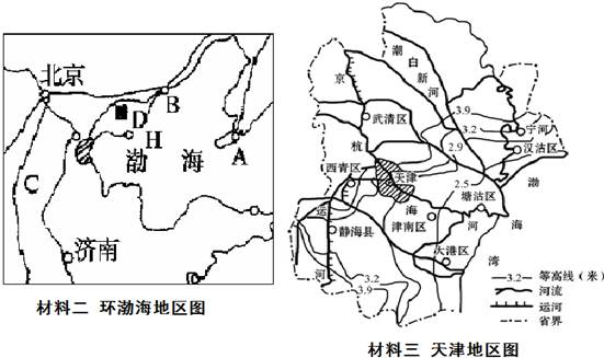 (3)依据材料三,简述天津市的地势特点,并说明理由。(6分)