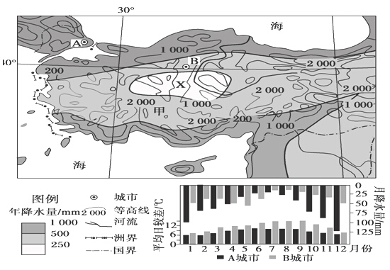 下图中甲国农业生产空间分布差异明显,沿海地区以园艺业为主,而中、东部内陆畜牧业较发达,安卡拉羊毛驰名世界。右下图是甲国A、B两地气候资料。读图回答下列问题。