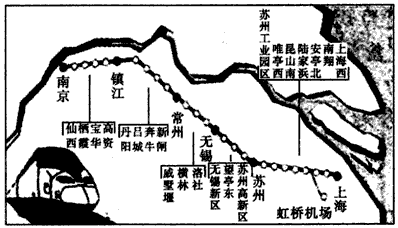 3、单选题 2010年7月1日上午8时,铁路上海虹桥站至南京站G5000次、南京站至上海虹桥站G5001次列车同时相向发车,这标志着目前我国乃至世界上标准最高、里程最长、运营速度最快的沪宁城际高速铁路正式投入运营。读图,回答1—2题。