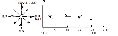 小题1:根据图示,风尾为旗帜的风速达8-12级,风速最大。12时前后风速大。所以本题选择B选项。