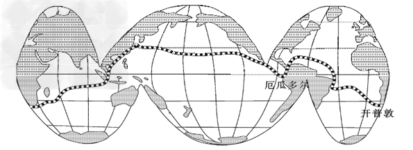 3、单选题 “大洋一号”第22航次自2010年12月8日从广州启航,历时369天,经历了9个航段,航程64162海里,于2011年11月1一日上午9:30返回青岛,完成我国最大规模环球大洋科考,下图为此次科考的路线示意。据此回答1—2题。