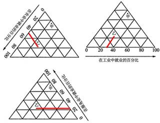 2.乙所表示的城市化阶段,通过判读图形可知(判读方法如下图):劳动力在农业、工业、服务业中就业的百分比分别大约是48%、30%、22%,城市化水平大约为劳动力在工业、服务业就业比重的和,即52%,对比图1应在第③时段。