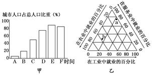 4、单选题  下面图甲为“城市人口占总人口比重变化图”,图乙为“劳动力在各行业中的百分比图”,读图,完成问题。