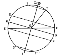 4、综合题  下图中XOY为地轴,MN为赤道,EF、E′F′为回归线,ST、S′T′为极圈。读图回答:(22分)
