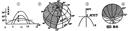 A、图①反映四地6月22日太阳高度日变化,四地纬度高低排序A>B>C>D
