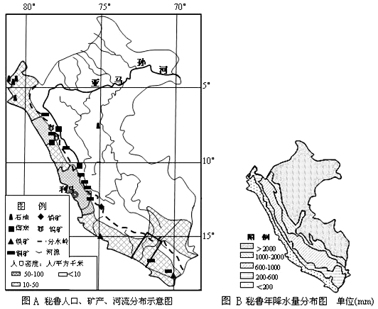 5、综合题 (16分)读图,完成下列问题。其中图A为秘鲁人口、矿产、河流分布示意图,图B为秘鲁年降水量分布图单位(mm)。