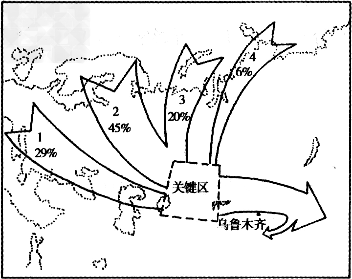 1、综合题 寒潮是新疆最严重的灾害性天气之一。造成新疆寒潮天气的冷空气源地最终可追溯到北冰洋及其附近地区。读冷空气的四条移动路径图,回答下列问题。
