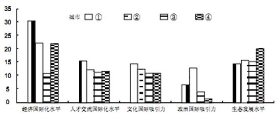 4、单选题 下图 是北京、上海、广州、深圳四城市国际化水平比较图。①②③④依次是