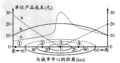 2、单选题  读某工业部门在某城市及其附近地区的土地、运输和劳动力等成本曲线图(其中土地成本和运费都只与距城市中心的远近、交通通达度有关),回答1—2题。?