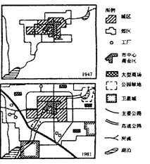 1、综合题 示为某大城市1947年和1981年的同比例尺平面示意图,比较两图回答。