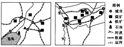小题1:由图可知,两个工业区附近都有丰富的煤炭资源,故钢铁工业发展初期,优势区位条件是煤炭丰富。