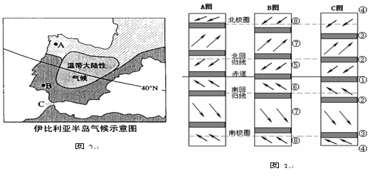 1、单选题 图2和图3分别是“伊比利亚半岛示意图”和“不同季节气压带、风带位置示意图”,读图3,当全球气压带、风带位置与C图相符时,下列关于图2中各地的说法,真实可信的是