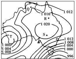 2、单选题 读澳大利亚某季节海平面等压线图(单位:hPa)和某地降水量统计图,回答小题。
