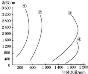 3、单选题  下图显示中国不同地区山地年降水量从山麓到山顶的变化。读图,回答第1~2题。