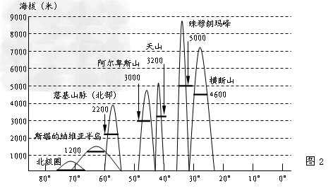 材料二:北半球一些著名山脉与山峰雪线高程图(图2)