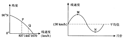 【小题1】P点地球自转线速度约为赤道上的一半,其纬度为60°N;右图中N点地球公转线速度达一年中最小值,为7月初。