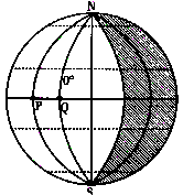 1、综合题 读某时刻光照图,阴影部分表示夜半球,回答有关问题:(8分)