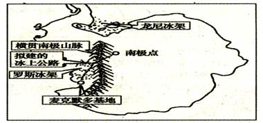 2、单选题  据报道,美国准备花5年时间,耗资1.25亿美元修建南极“高速公路”。这条特殊的“高速公路”起点站是麦克默多,横跨罗斯冰架,越过南极山脉,到达南极点,全程1 600千米。读图回答19——20题。