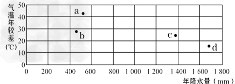 4、单选题 读我国四座城市气温年较差和年降水量坐标图,回答1-2题。