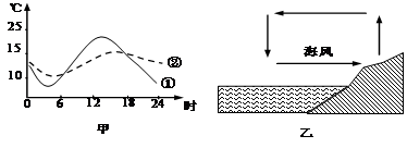 1、单选题 下图中,甲图表示的是某滨海地区陆地和海洋表面气温日变化的曲线图,乙图表示的是该地区海陆之间气流的变化图,回答下题。