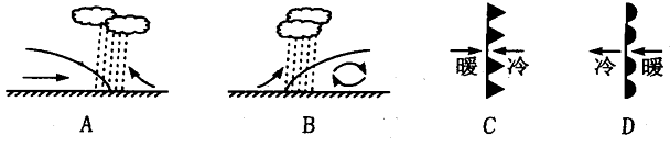 1、单选题 下面所示四幅图中,表示暖锋天气的是( )
