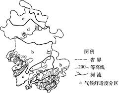 1、单选题 下图示意某省气候舒适度分布。以平均气温 24℃、相对湿度70 %、平均风速2m/s作为人体最舒适气候条件,据此划分出最舒适区、舒适区、一般区、不舒适区与最不舒适区。读图回答下列各题。