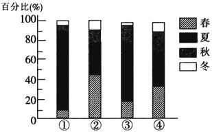1、单选题 读我国南昌、兰州、北京、乌鲁木齐四地春、夏、秋、冬四季降水量占全年降水总量的百分比图,回答1~2题。