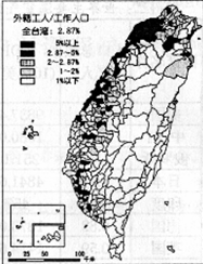 2、单选题 图为2000年台湾外籍工人分布图。请回答下列各题
