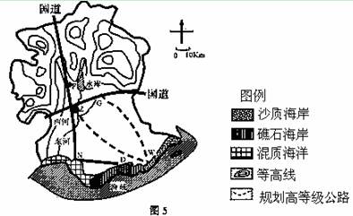 3、单选题 图5为某地级市的市城城镇体系规划示意图。该市沿海有N、D、W三个县城。东邻海岸为沙质岸线,沙软潮平,水质清流,附近有海岛;中部主要为礁石海岸,距海岸500m处水深可达20—25m;西部沿海有大面积的盐田。读后完成7—9题。