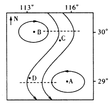 2、单选题 下图表示某区域高空风向分布,A、B、C、D为高空中的四点,据图完成下面问题。