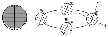 2、综合题 读某日半球昼夜分布图(阴影代表黑夜)和地球公转二分二至日示意图。回答下列问题。