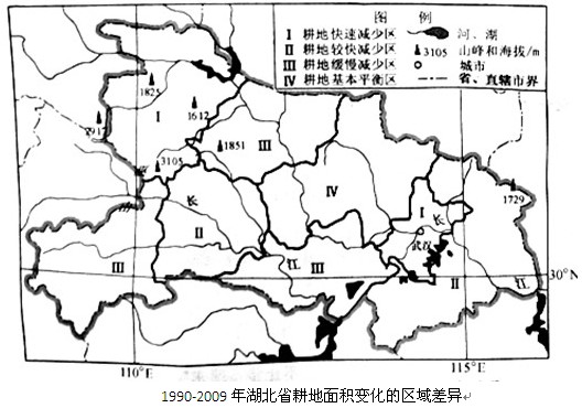 (1)根据图中经纬度和图例信息可知,两个I区分别位于西北部山区和东部平原、湖区,根据材料一中提示“夯实农业发展基础,调整产业结构,优化产业布局”,西北部山区地形起伏大,水土流水严重,不适宜大力发展种植业,因而实施退耕还林使耕地快速减少,东部平原、湖区属于湖北人口密集和城市化水平高的地区,城市化和退田还湖使耕地快速减少。